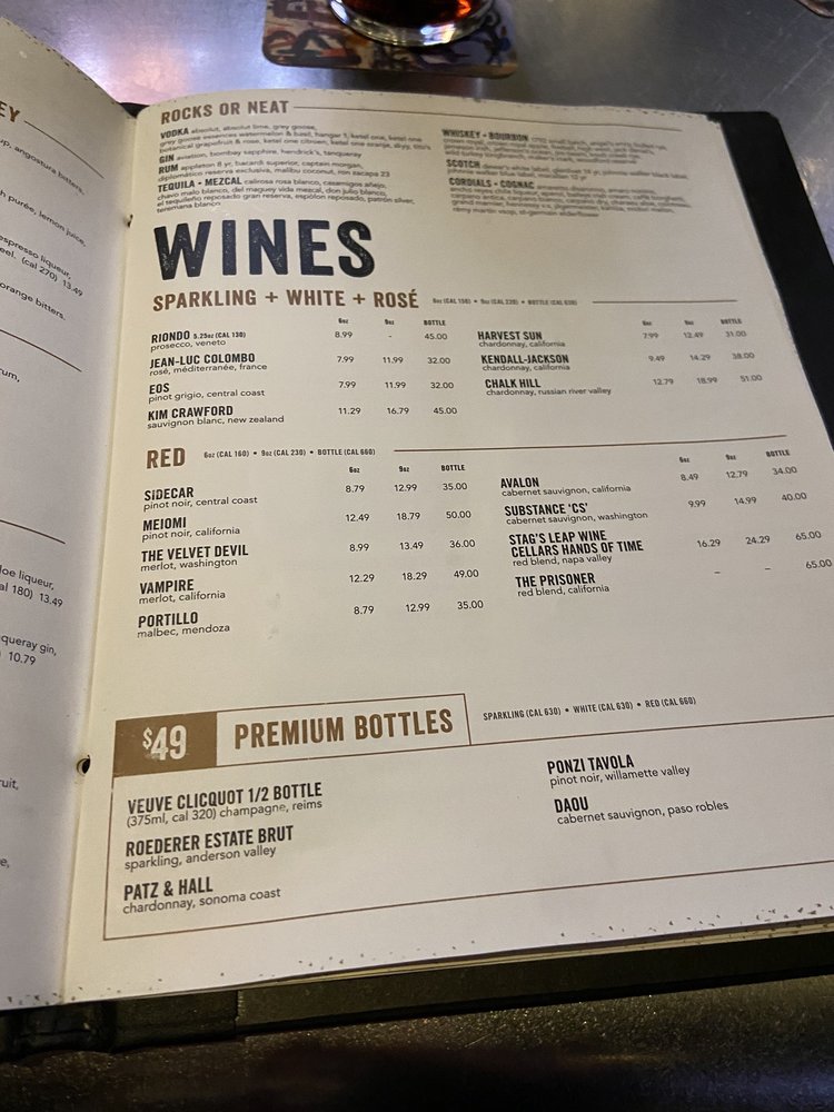 Screen press pinot noir, r-my martin vsop cognac, orange liqueur, citrus agave, honey syrup, orange, mint. (cal 220)